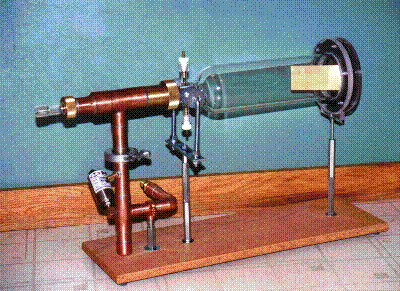 The 1997 National Symposium of the American Vacuum Society featured an exhibit on the history of the electron, celebrating the 100th anniversary of the discovery by Sir John Joseph Thomson (1856-1940) that the electron was a particle with mass. The exhibit represented a collaboration between the AVS and the Perham Foundation of Los Altos, CA. Included in the exhibit were a display of historic vacuum tubes, a 40 ft. timeline with important events in the history of vacuum and electronics from 1875 to the present, videos related to the history of vacuum tubes and radio, and three displays specific to Thomson's work. One was a non-functional replica of Thomson's cathode ray tube with which he determined the ratio of the electron's charge to its mass (e/m), a commercial e/m apparatus for school use (made by Pasco Scientific of Roseville, CA) and the home-brew apparatus shown above that was made by the author. Details on the construction and use of the apparatus are in Vol. 6, Nos. 3&4 (combined issue). | ![]() |