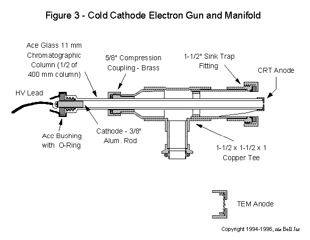 Figure 2 shows the system with an electron beam apparatus that may be constructed with more plumbing supply parts, a surplus cathode ray tube envelope, and some easy-to-obtain specialty parts.